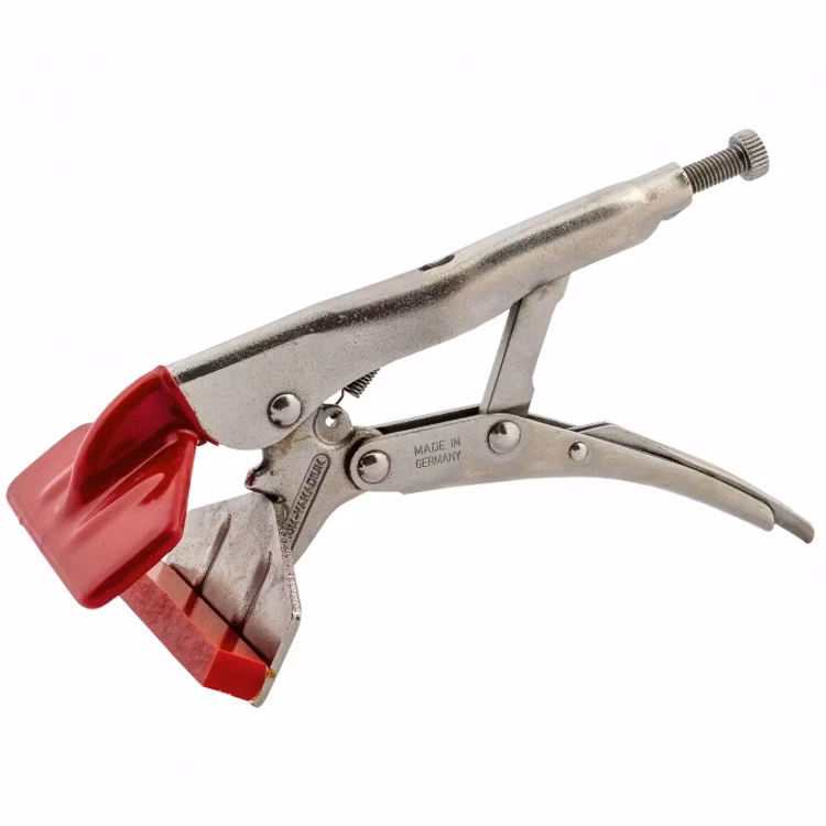 Grepptång med plastbackar avsedd för mjukare material som aluminium, zink och koppar.Den röda plastbacken ska inte sitta helt fast så skruva därför inte åt skru